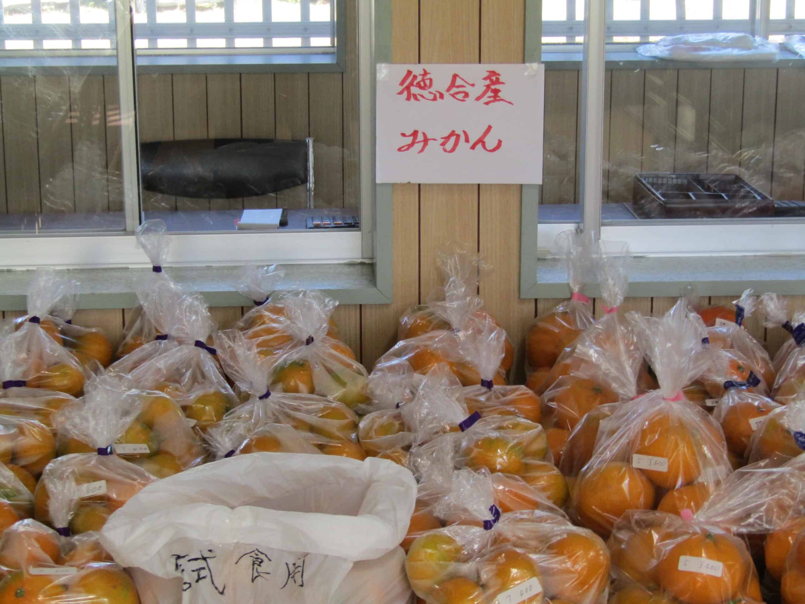 白菜、ネギ、自然薯などの新鮮な野菜が沢山並べられたほか、徳合産のみかん