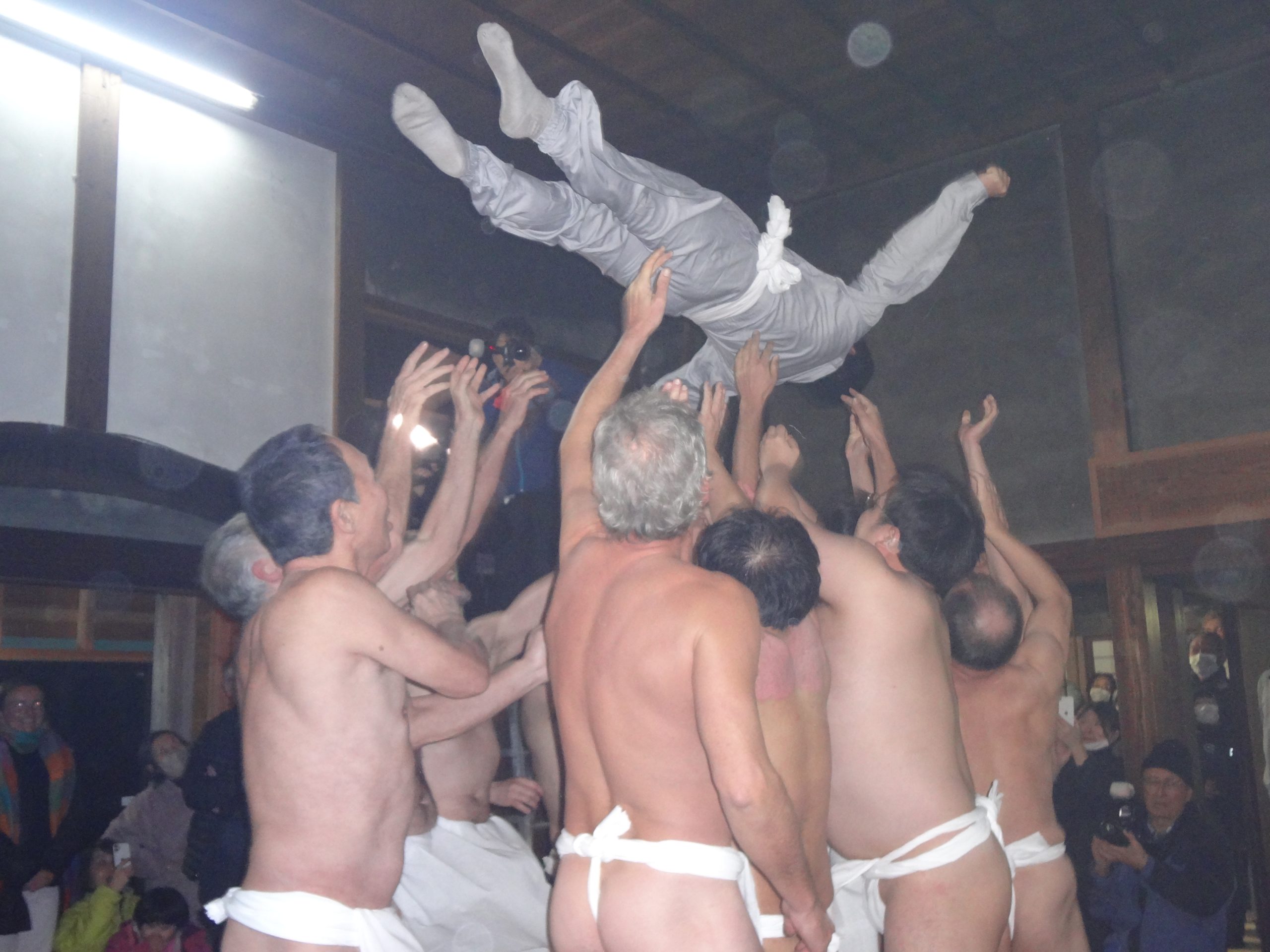 締め込み姿の若者衆がその年の厄年の人を観音堂の天井に向かって放り上げ、無病息災を祈願する行事です。